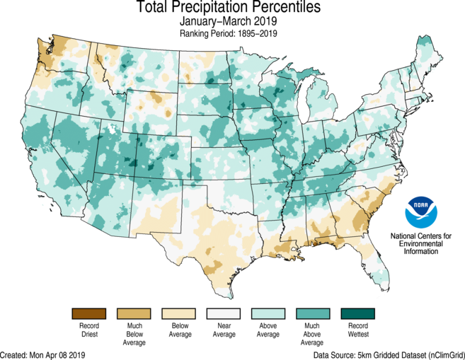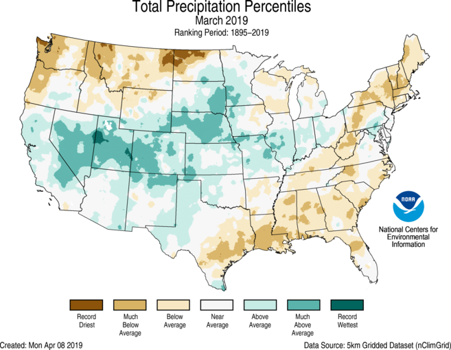 Below-average precipitation was observed across the South and parts of the Southeast. Washington ranked 10th driest for the year-to-date period. Above-average precipitation stretched from coast-to-coast with many states having one of their 10 wettest January–March periods on record; Colorado was fourth wettest, Tennessee and Utah were fifth wettest and Nevada sixth wettest.Below-average precipitation was observed across the South and parts of the Southeast. Washington ranked 10th driest for the year-to-date period. Above-average precipitation stretched from coast-to-coast with many states having one of their 10 wettest January–March periods on record; Colorado was fourth wettest, Tennessee and Utah were fifth wettest and Nevada sixth wettest. Billion Dollar Weather and Climate Disasters