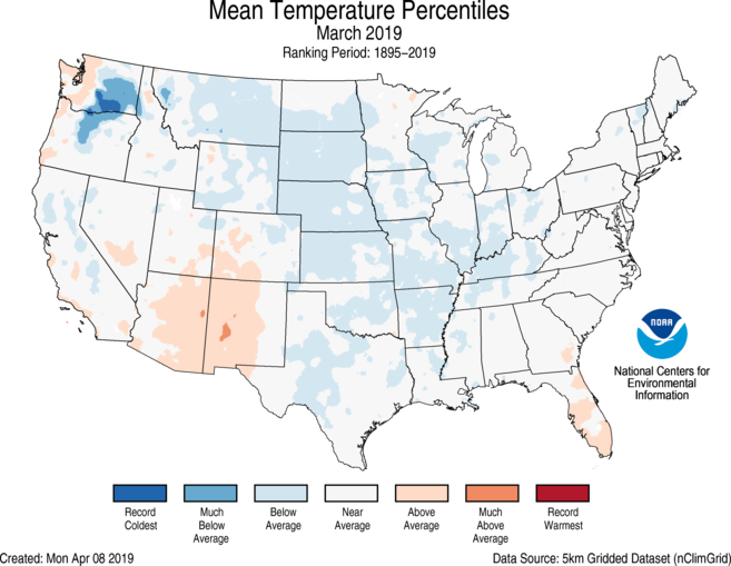 Below-average temperatures were observed in the Northwest, the Great Plains and across portions of the Mississippi and Ohio River valleys. A small pocket of record-cold temperatures was evident across a portion of Washington state. Arizona and New Mexico had above-average temperatures during March, while most of the contiguous U.S. experienced near-average temperatures for the month.