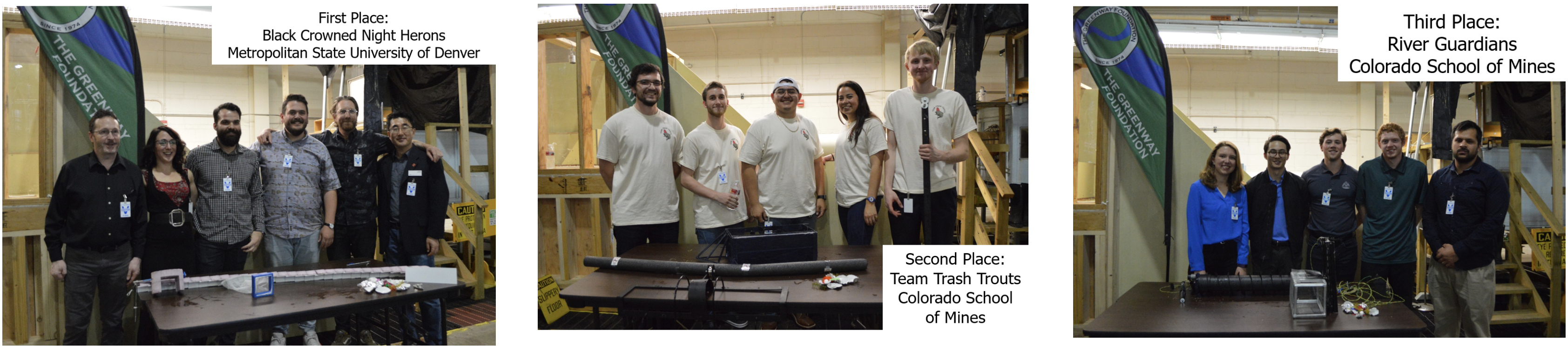 Third Place: Team Black-Crowned Night Herons from Metropolitan State University of DenverFour teams continued onto Round 2, to build a scaled model of their design and test it in a specialized flume at the U.S. Bureau of Reclamation. The top three designs were selected based on a variety of criteria: design, impact on the river corridor, amount of trash collected, cost, etc.