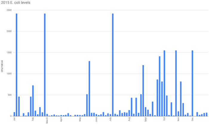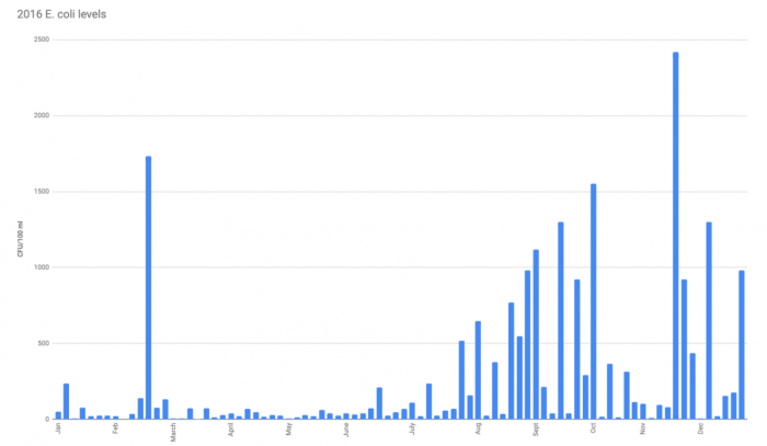 2016 E. coli levels exceeded the EPA standard 28 times.