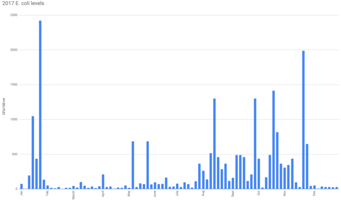2017 E. coli levels exceeded the EPA standard 34 times.