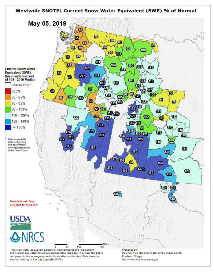 The largest increases in water supply forecasts between April 1st and May 1st occurred in the Green River basin in Wyoming, and the San Juan, Gunnison, and Dolores River Basins. Significant increases also occurred throughout the Great Basin, Duchesne, San Rafael and Sevier River Basins in Utah. Forecasts in the Upper Colorado River headwaters and Yampa River basins had slight increases or remained similar to the April 1st forecasts. April-July runoff volume forecasts now range from near 115 to 200 percent of average. Currently only a few northern headwater basins of the Green River Basin in Wyoming and the Great Basin (Bear River Basin) have forecasts below average for the 2019 season.