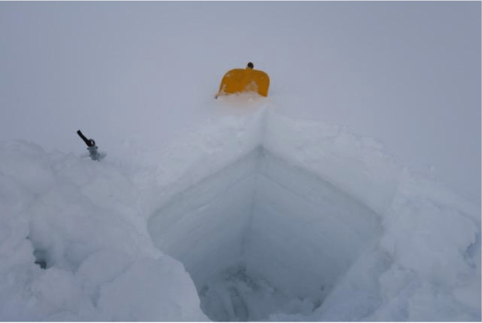 A snow pit on Loveland Pass shows a narrow stripe of dust near the surface. When it’s exposed, the dust can speed up melt off by a couple weeks. Photo credit: Center for Snow and Avalanche Studies via KUNC