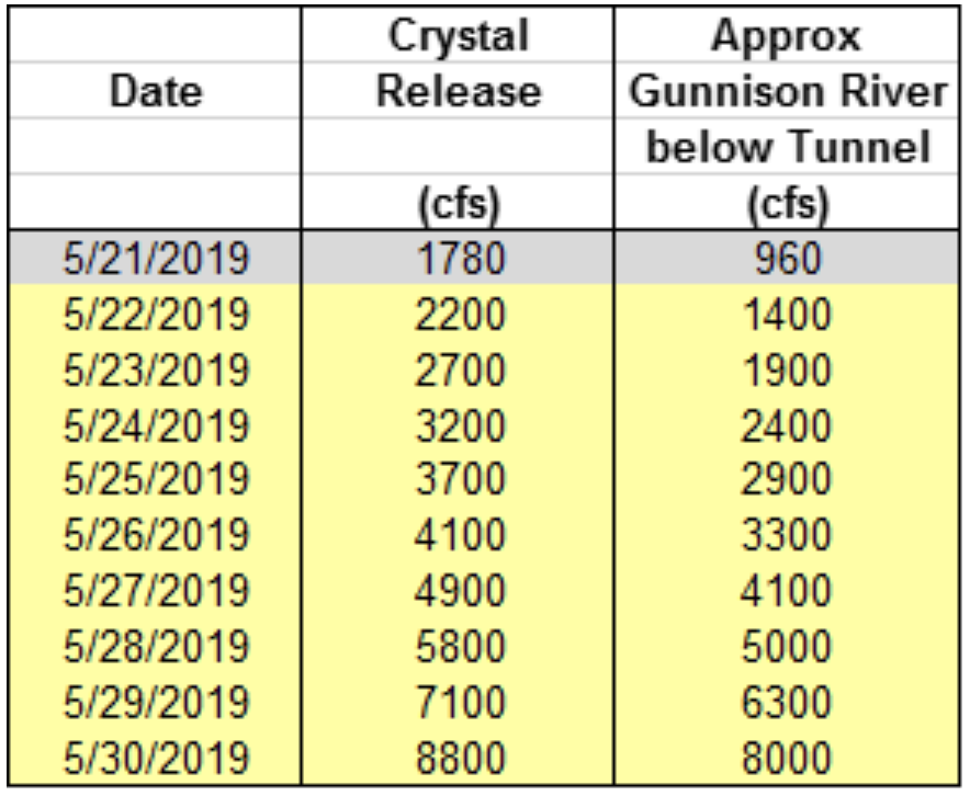 Therefore ramp up for the spring peak operation will begin on Wednesday, May 22nd, with the intent of timing releases with this potential higher flow period on the North Fork of the Gunnison River. Releases from Crystal Dam will be ramped up according to the guidelines specified in the EIS, with 2 release changes per day, until Crystal begins to spill. The release schedule for Crystal Dam is: