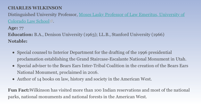CHARLES WILKINSON: A lot of people of my vintage give the same answer, which is Wallace Stegner’s book. (“Beyond the Hundredth Meridian: John Wesley Powell and the Second Opening of the West.”) I proceeded to read about half of Stegner’s other works in a month. Finally, I wrote him a letter. He said come down and we’ll talk, and we became close friends. [Former Secretary of the Interior] Bruce Babbitt said Stegner’s book was the “rock that came through the window” for him, and I think Powell is somebody you can look at that way. He opened so much for us. He was the Lewis and Clark of the Southwest. The country didn’t know about the region and Powell picked up so much information about it.