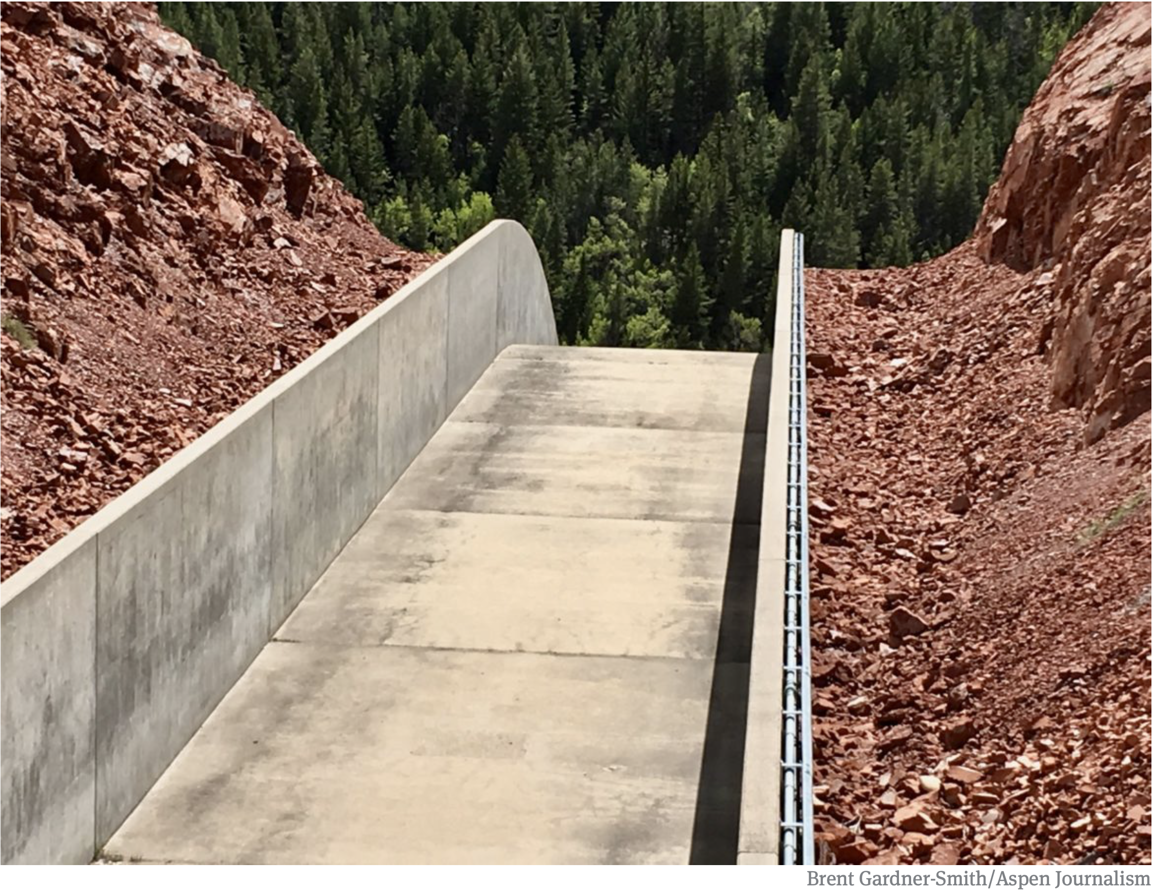 The ungated spillway at Ruedi Dam and Reservoir, which automatically spills water into the lower Fryingpan River should the reservoir ever fill beyond its holding capacity of 102,373 acre-feet.