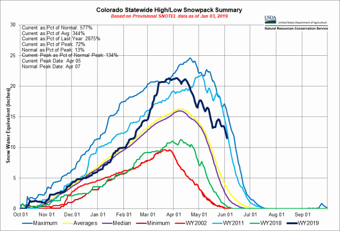 We’ve made a big deal about these statistics, and snowpack is unquestionably far higher than where it normally is for the beginning of June. But, these numbers – while true, of course – might be a bit misleading and worth an extra note of clarification. On Friday, the Colorado Climate Center sent a series of tweets to help explain the significance behind some of the snowpack data figures that have garnered so much attention.