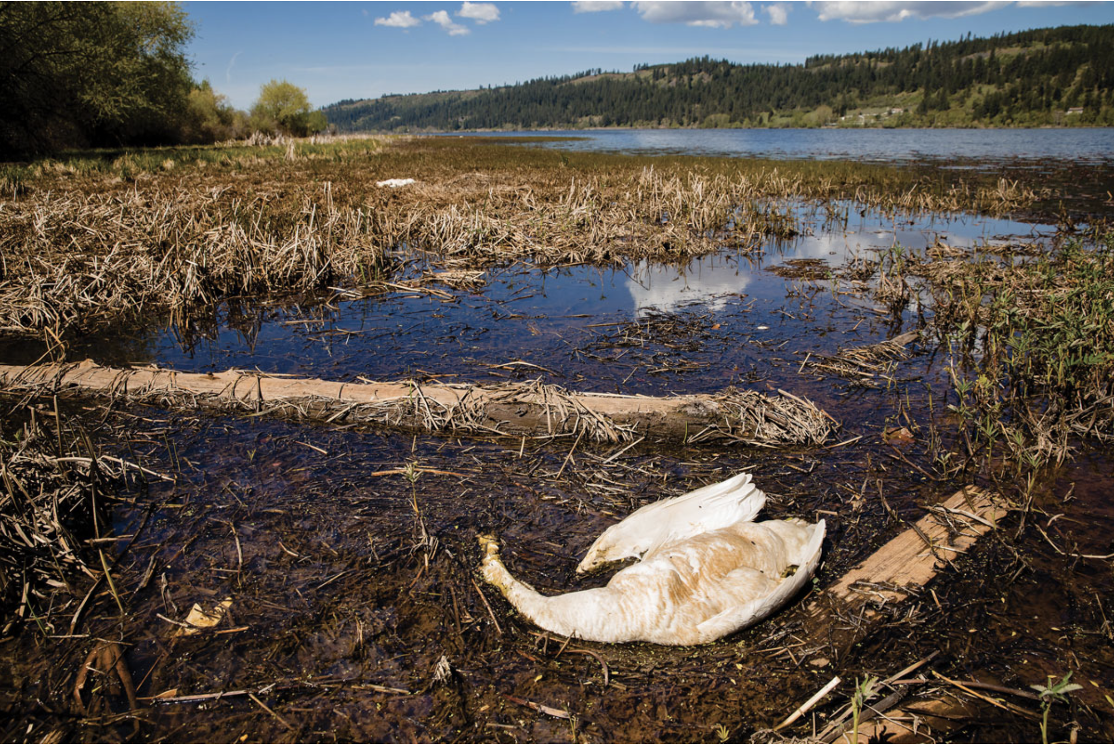 From a few thousand feet, the birds would have seen the expanse of the lake, surrounded by forested hills and shaped roughly like a human arm. Near the elbow, they would have flown over the political boundary marking the edge of the Coeur d’Alene Tribe’s reservation, which encompasses the southern third of the lake. To the north, the swans, thousands of them, would have glimpsed the high-rises of the resort town of Coeur d’Alene at the lake’s edge, and the lake’s outlet, the Spokane River, winding west. They would have passed sandy beaches and rocky peninsulas dotted with marinas, parks, homes and resorts, and the Coeur d’Alene River, which meets the lake at Harrison Slough. It is an appealing place to alight — and a lethally toxic wetland.