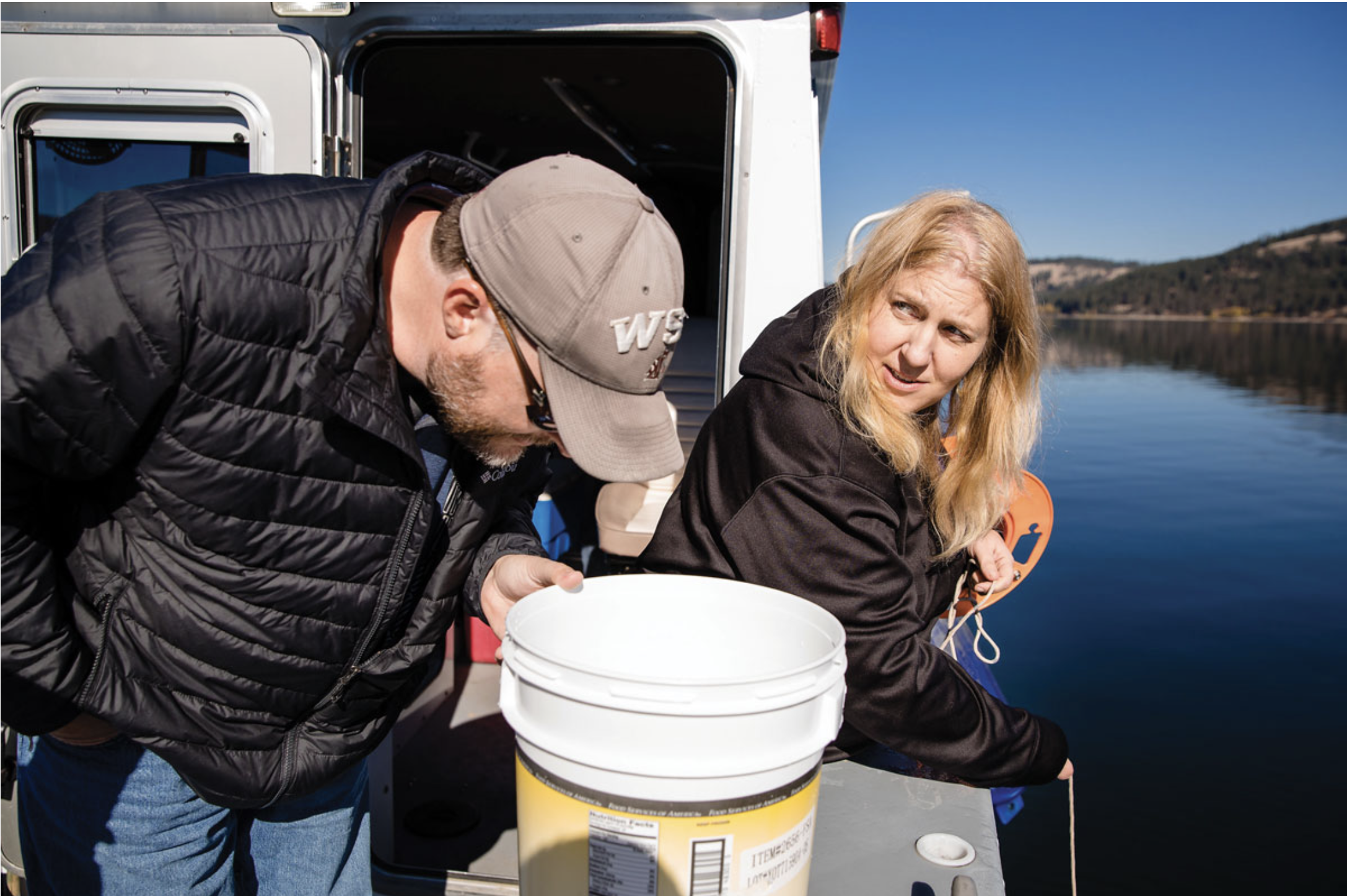 Laura Laumatia and Scott Fields, with the Coeur d’Alene Tribe’s Lake Management Department, collect and inspect water samples. Photo credit: Jerome Pollos for High Country News