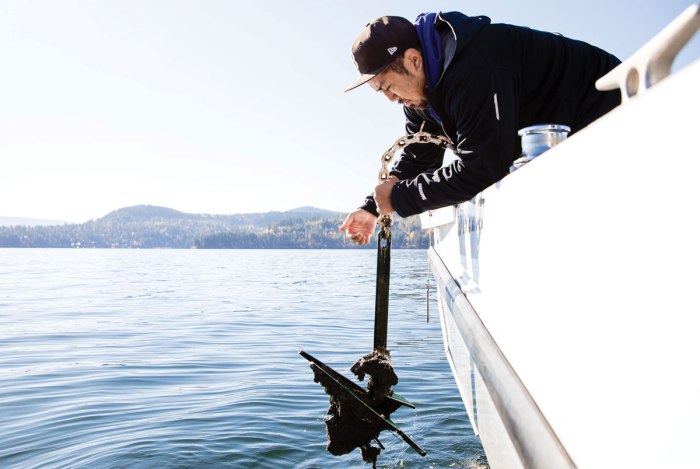 Michael George, a water resources technician for the Coeur d’Alene Tribe’s Lake Management Department, retrieves a sediment-covered anchor from the bottom of Coeur d’Alene Lake during a data collection trip in October. The amount of organic materials and nutrients in the sediment are indicators of excessive nutrient loading from the lake’s watershed. Photo credit: Jerome Pollos for High Country News