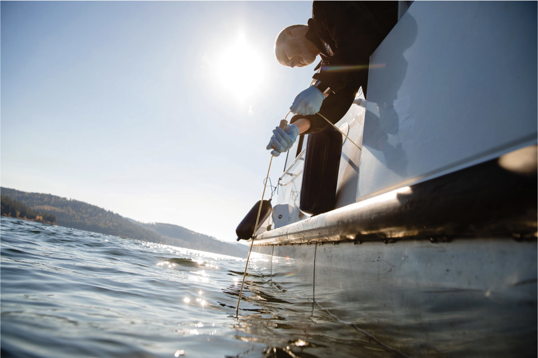 Dale Chess, a limnologist for the Coeur d’Alene Tribe’s Lake Management Department, retrieves a water sample from the southern end of Coeur d’Alene Lake, near Plummer, Idaho, to test the oxygen levels during a research trip last October [2018]. Photo credit: Jerome Pollos for High Country News