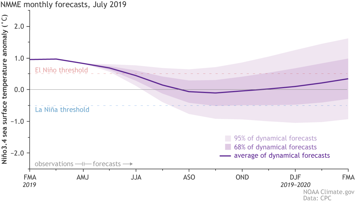 Climate model forecasts for the Niño3.4 Index. Dynamical model data (purple line) from the North American Multi-Model Ensemble (NMME): darker purple envelope shows the range of 68% of all model forecasts; lighter purple shows the range of 95% of all model forecasts. NOAA Climate.gov image from CPC data.