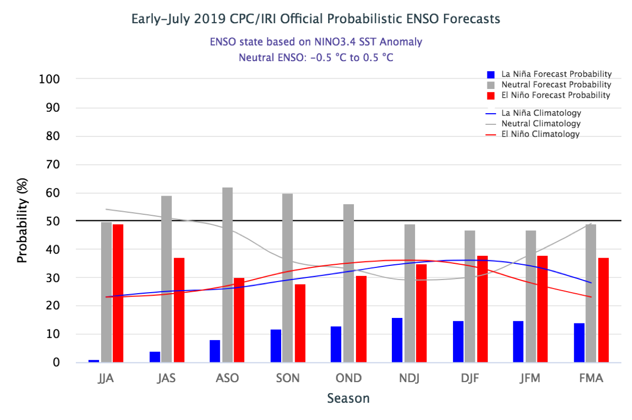 Vertical bar histogram showing probabilities for La Niña (blue), neutral (gray), and El Niño (red) conditions for the remainder of 2019 and into early 2020. Dashed lines show climatological (historical average) probabilities for these same three ENSO conditions. Figure from IRI.