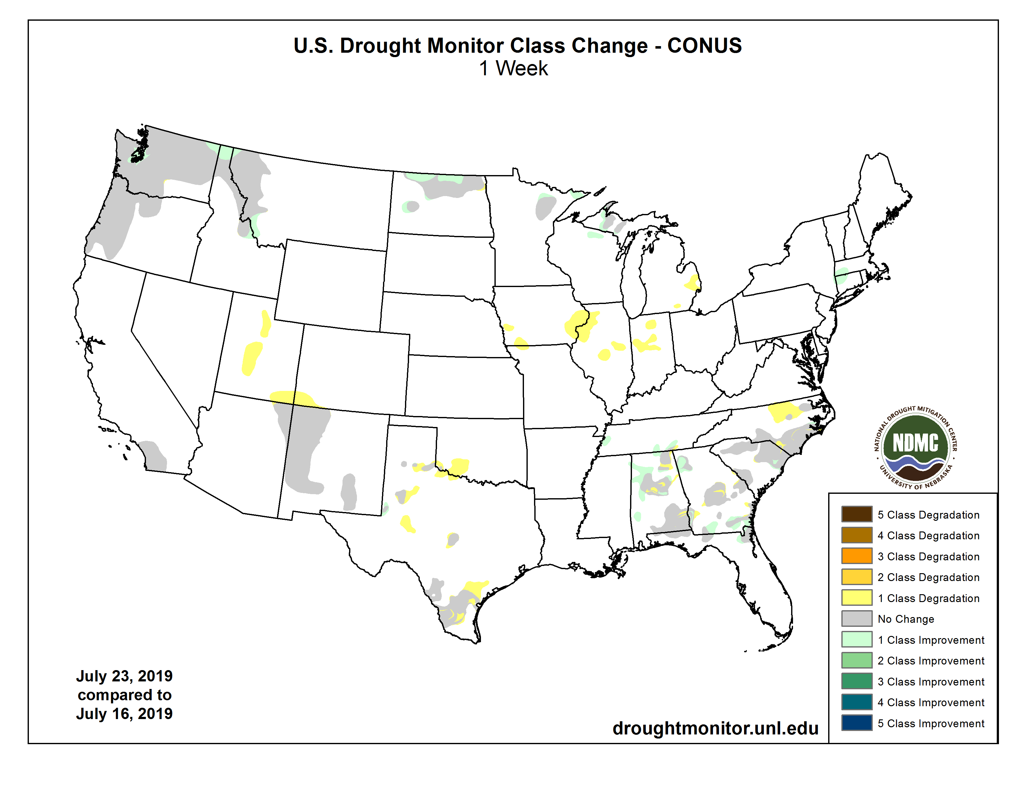 A sluggish start to the Southwestern monsoon season, particularly in Arizona, Utah, and southwestern Colorado, led to some modest expansion of abnormal dryness (D0). Locations in or near the new D0 areas that received only a trace of rain during the first 23 days of July included Cortez, Colorado (0.69 inch below normal), and Cedar City, Utah (0.54 inch below normal). Farther north, some reassessment of conditions near the Canadian border led to the removal of severe drought (D2) from northeastern Washington into northwestern Montana, based on recent precipitation trends, streamflow, and other drought indicators. Similarly, a small lobe of D0 was removed from southwestern Montana. Closer to the Pacific Coast, enough precipitation has recently fallen in western Washington to result in a slight reduction in the coverage of D2. Still, some significant topsoil moisture shortages exist in parts of the Pacific Northwest. On July 21, USDA rated topsoil moisture 64% very short to short in Oregon and 57% in very short to short in Washington…
