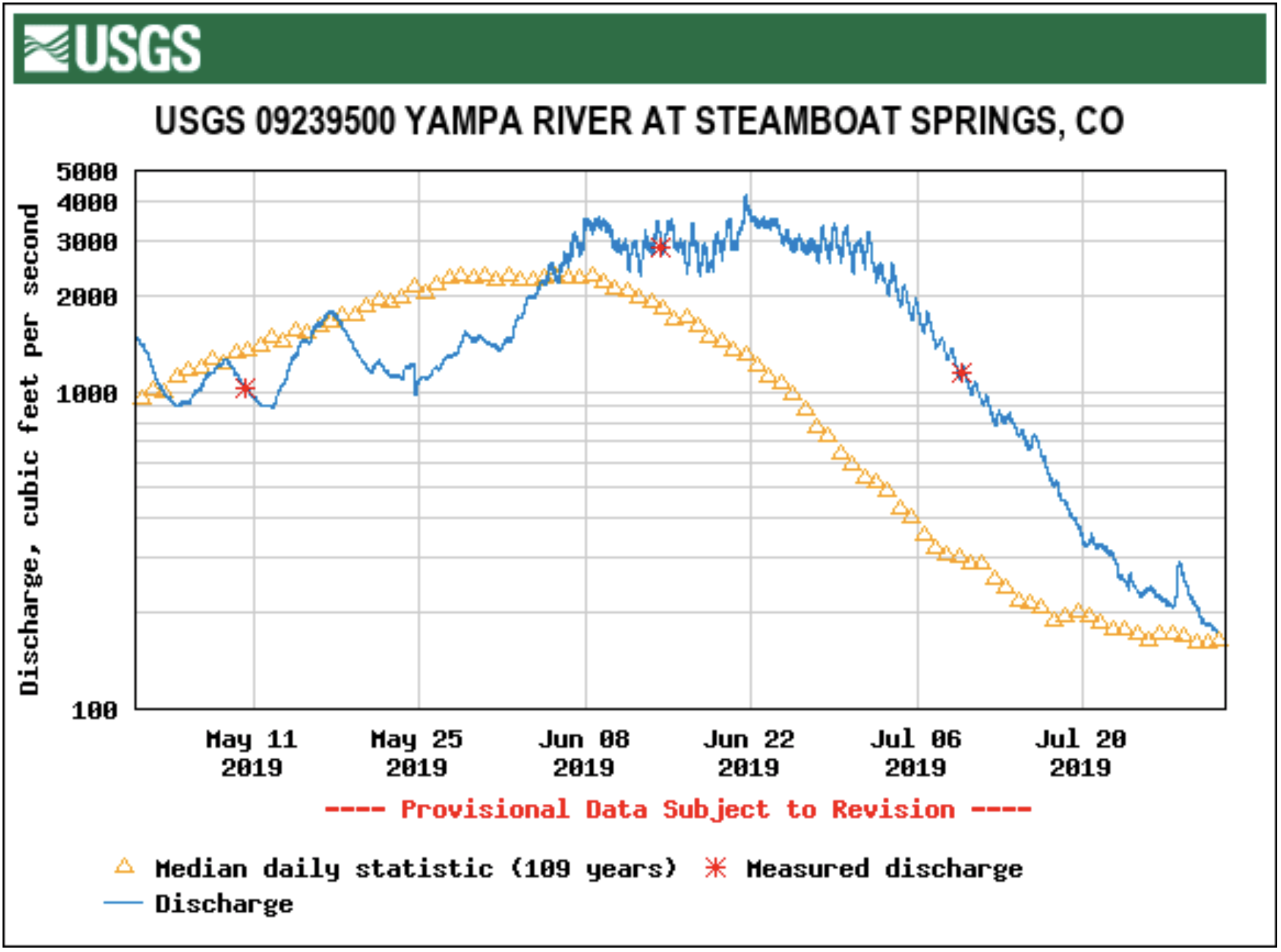 “We see the hydrograph tail off after the peak snowmelt, and then it hovers above 100 cfs typically for the majority of the summer, but it can depend on what’s happening with releases out of Stagecoach Reservoir and irrigation diversions upstream from town and the weather,” Romero-Heaney said…
