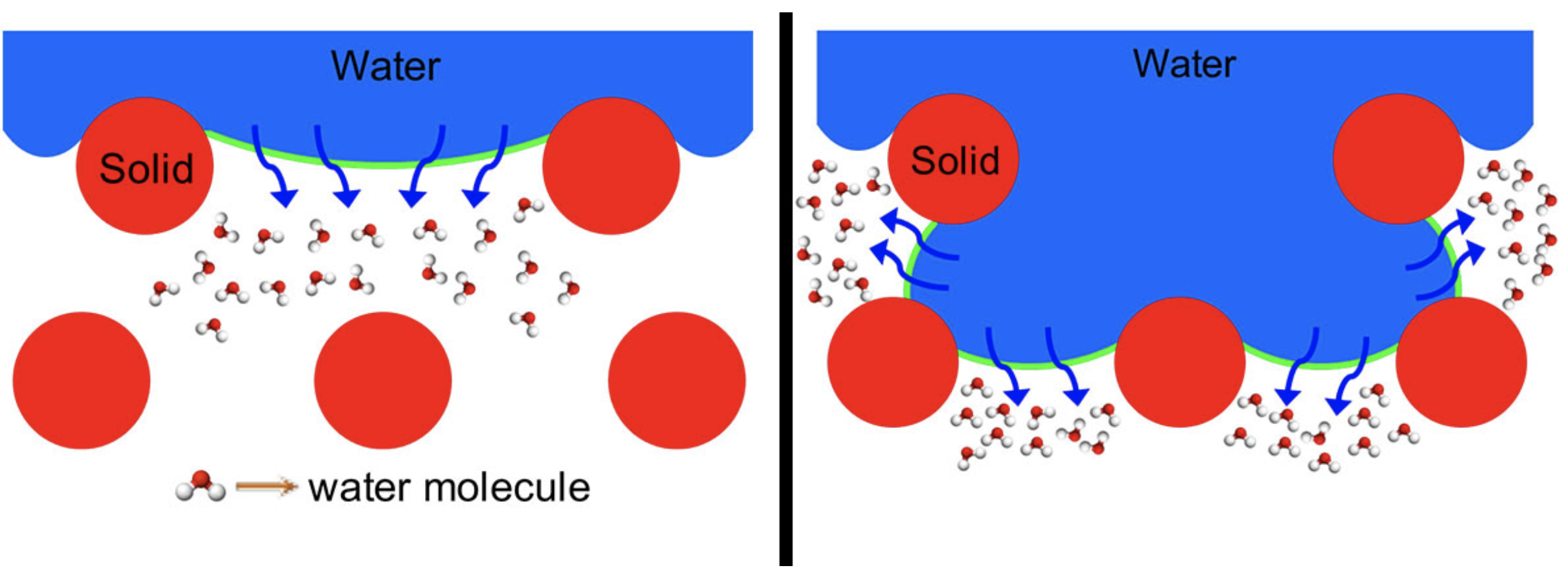 The CSU researchers set out to discover why this tradeoff between hydrophobic vs. omniphobic membranes exists. Through systematic experiments in the lab led by postdoctoral researchers Wei Wang in Kota’s lab, and Tong’s graduate student Xuewei Du, they found that conventional hydrophobic membranes create a larger liquid-vapor interfacial area. This increases the amount of evaporation taking place. With the omniphobic membranes, they saw a much smaller liquid-vapor interface. This explains the difference between the membranes’ performances.