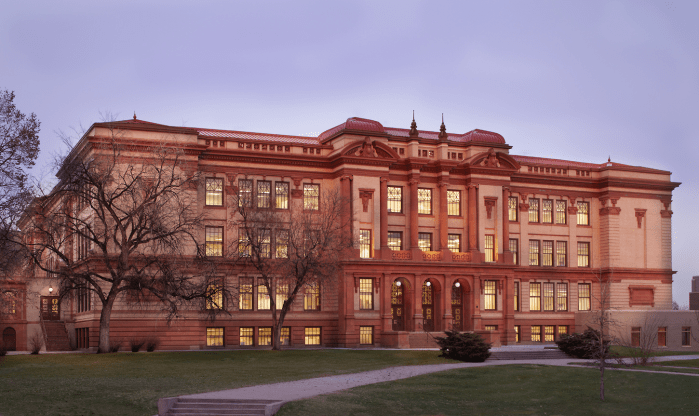 Denver North High School at dusk. Photo credit: Humphries Poli ArchitectsFrom a hallway at Denver North High School August 24, 2019.Wood carving of a Viking ship from the Denver North High Alumni Center August 24, 2019.