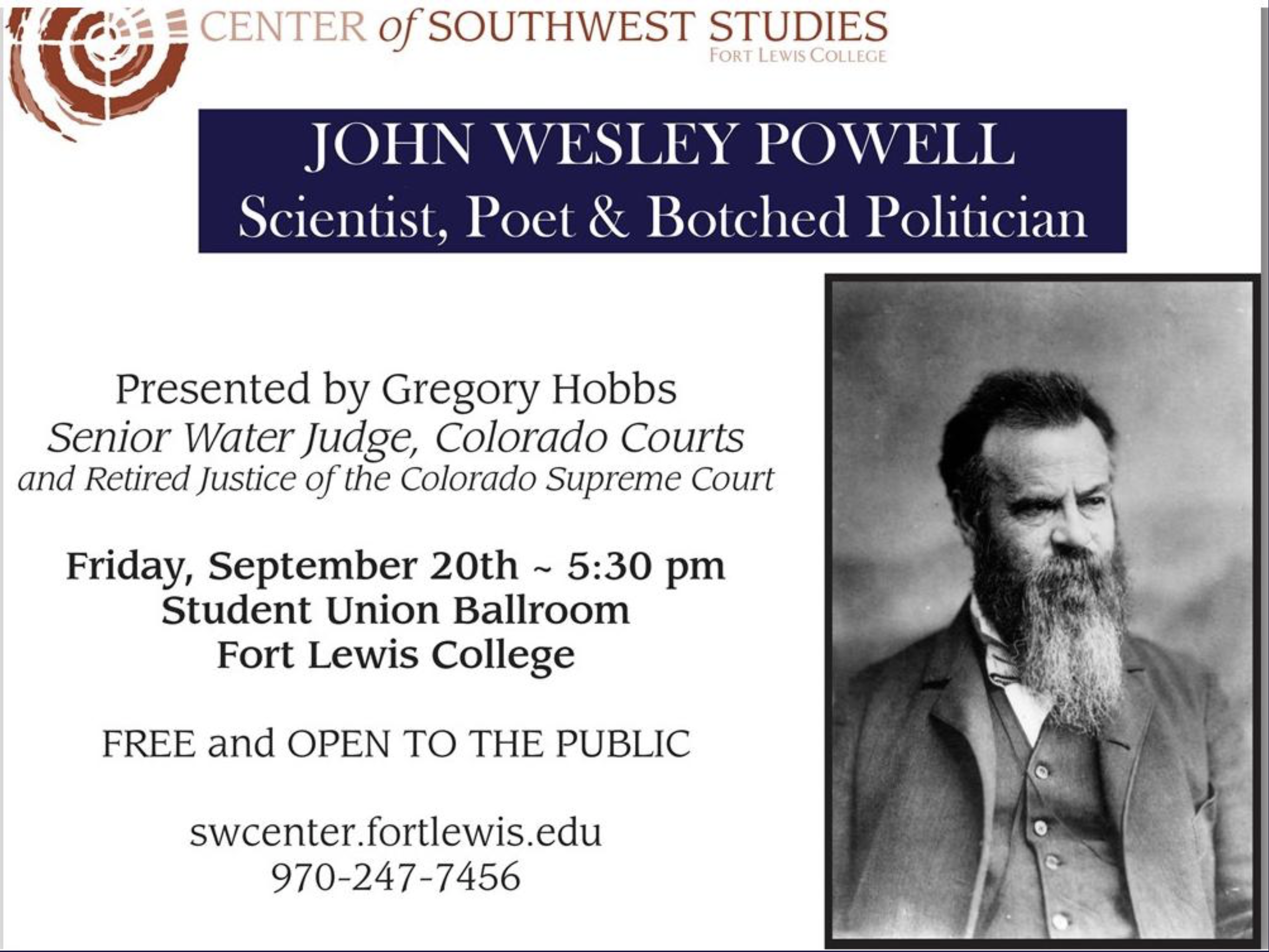 On the 150th Anniversary of John Wesley Powell’s first Colorado River Run, retired Justice Gregory Hobbs of the Colorado Supreme Court will revisit Powell’s journeys into the Colorado River Plateau and his genius as a first-hand leading spokesperson of the western experience.