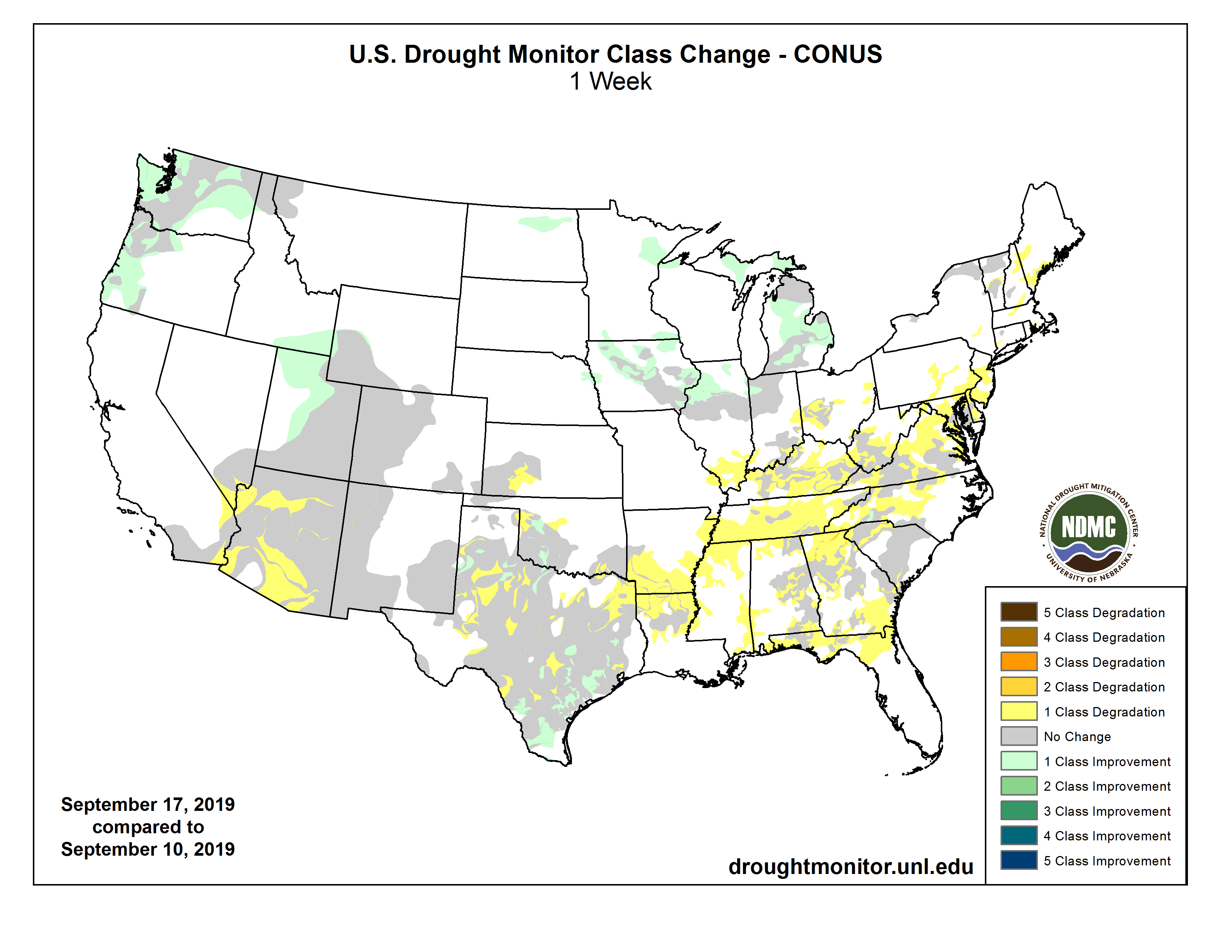 As with the Southeast, intense late-summer heat and acute short-term dryness led to a sharp increase in drought intensity and coverage across central portions of the region. Excessive heat (95-102°F) and pronounced short-term rainfall deficits (30-day rainfall totaling locally less than 10 percent of normal) heightened evapotranspiration rates and soil moisture losses, resulting in quickly escalating drought impacts (often referred to as a “flash drought”.) It should be noted that “flash drought” often occurs more quickly (in terms of impacts) than the data indicates. In terms of temperatures, Wednesday, September 18th marked the 18th consecutive day of 90-degree heat at Little Rock, Arkansas (the long term historical total-September average is 9 days); September 18th also marked the 7th day with 100-degree readings at Meridian, Mississippi (only one other year—1980—had this many, and only 7 other years total had 3 or more (records dating back to 1889)). For this weeks’ analysis, the expansion of D0 (Abnormal Dryness) as well as Moderate (D1) to Extreme Drought (D3) was driven by guidance from local experts, impact reports from observers, as well as temperature- and rainfall-driven data products which focused on the past 30 to 60 days. Increases in drought were most pronounced from central and northeastern Texas into the central and northern Mississippi Delta, where 60-day rainfall has totaled a meager 25 percent of normal or less. State-wide average topsoil moisture was rated more than 70 percent short to very short (according to USDA-NASS) as of September 15 in the Mississippi Delta States, and 83 percent poor to very poor in Texas (tied for second highest in the nation with Virginia, only 2 percentage points behind California’s 85 percent). Despite the generally dry, hot weather pattern, heavy showers and thunderstorms (2-4 inches) provided highly localized drought relief across southeastern and north-central Texas as well as western Oklahoma. After the end of the monitoring period (12z Tuesday), heavy showers associated with the remnants of Tropical Storm Imelda were bringing rain to southeastern Texas; the impacts of this rainfall will be incorporated in next week’s U.S. Drought Monitor…