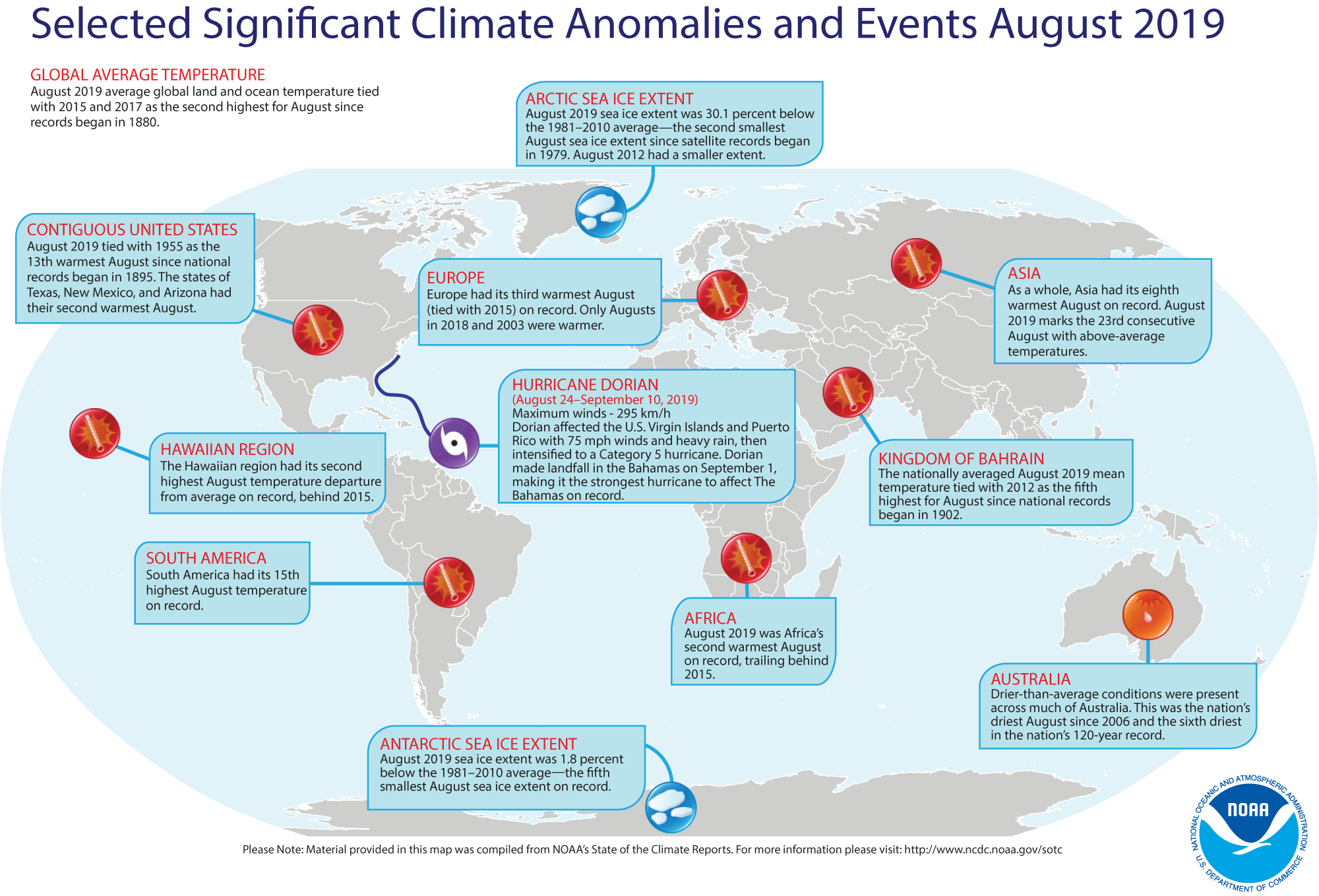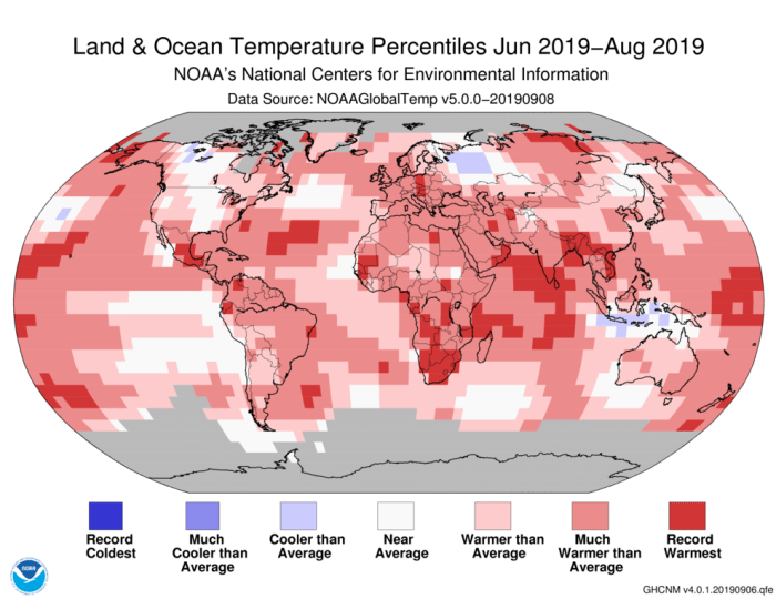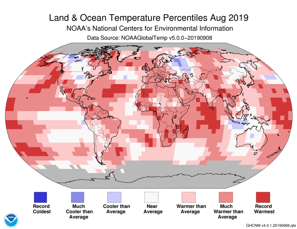 The global land and ocean surface temperature departure from average for August 2019 tied as the second highest for the month of August in the 140-year NOAA global temperature dataset record, which dates back to 1880. The June–August 2019 temperature was also second highest and the January–August temperature was the third highest such period on record.