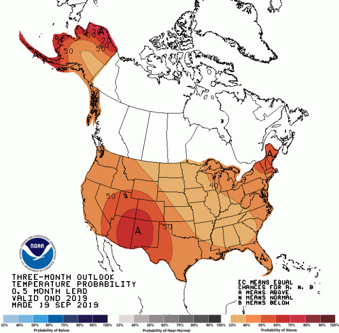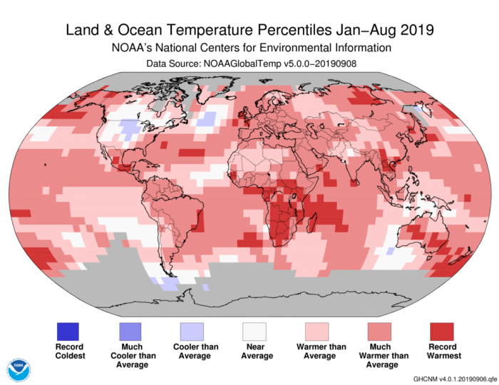 The year-to-date temperature across global land and ocean surfaces was 1.69°F above the 20th century average of 57.3°F — the third highest for January–August in the 140-year record, trailing behind 2016 (+1.94°F) and 2017 (+1.71°F). The year-to-date period was characterized by warmer-than-average conditions across much of the globe’s land and ocean surface. Notable warm temperatures were present across much of Alaska, northwestern Canada and central Russia, where temperatures were at least 4.5°F above average. The most notable cooler-than-average temperatures were present across much of the contiguous United States and the southern half of Canada, with temperatures at least 1.8°F below average or cooler. Record-warm temperatures during the year-to-date period were present across parts of the southern half of Africa, Australia, Alaska, Mexico and Asia, as well as across New Zealand and its surrounding ocean, western Indian Ocean and North Pacific Ocean. No land or ocean areas had record-cold temperatures during January–August 2019. The year-to-date globally averaged land surface temperature was 2.56°F above the 20th century average of 48.1°F. This value was also the third highest for January–August on record — only 2016 and 2017 were warmer. Regionally, South America, Europe, Africa, Asia, Oceania and the Hawaiian region had a January–August 2019 temperature departure from average that ranked among the five highest such period on record. The year-to-date globally averaged sea surface temperature was 1.37°F above the 20th century average of 61.1°F. This was the second highest for January–August in the 1880–2019 record, trailing behind 2016 by 0.13°F.