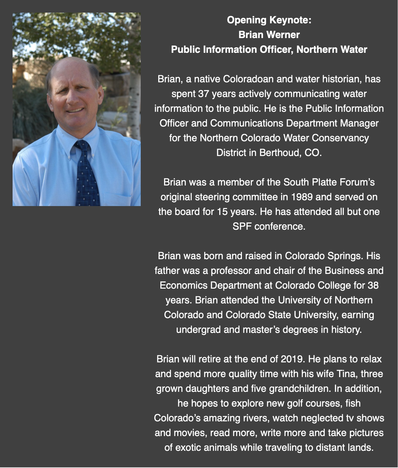 We are honored to have over twenty expert and informative speakers joining us this year at The Westin for the 30th anniversary South Platte Forum on October 23rd and 24th.