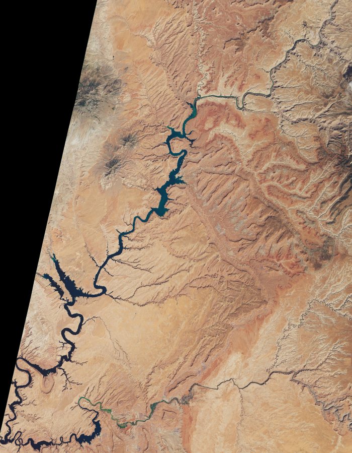 Heavy snowfall in the Rocky Mountains in the winter and spring of 2019 provided a much-needed pulse of meltwater into Lake Powell, the second largest reservoir (by maximum water capacity) in the United States. Still, the effects of long-term droughts and rising air temperatures, combined with increasing demands for water in the American Southwest, mean the lake is still nowhere near its highs from the 1980s and 90s.