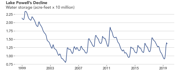 Lake Powell volumes January 1999 – August 2019. Graphic credit: Reclamation