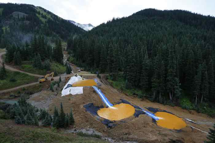 Water from the 2015 Gold King mine spill flows through retention ponds built to contain and filter out heavy metals and chemicals. AP Photo/Brennan Linsley via Colorado State University