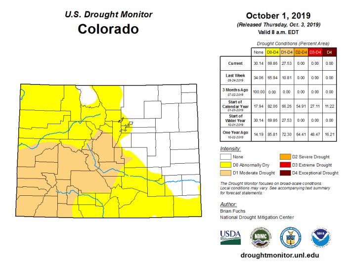 A winter thick with snow and a spring full of rain broke a 20-year streak of drought conditions in the state of Colorado, though slight rainfall in late summer brought back abnormally dry conditions in late July, according to the U.S. Drought Monitor. Routt and Moffat counties are currently in abnormally dry conditions, according to the Drought Monitor.