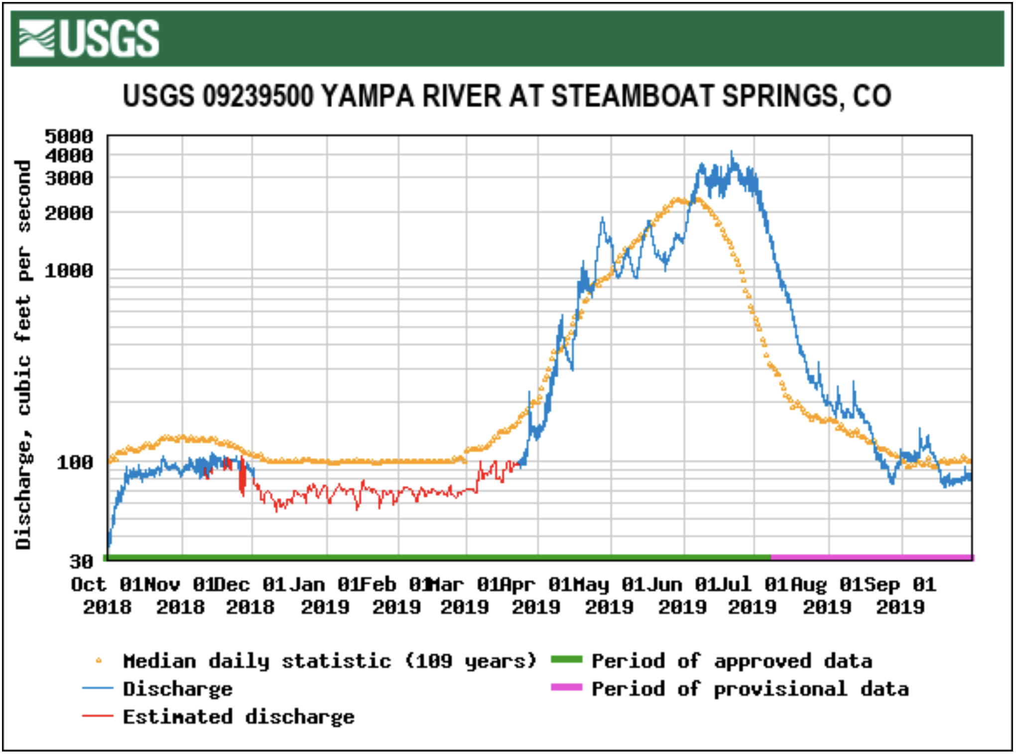Cool spring temperatures melted snowpack off slowly, giving irrigators time to use that water before it flowed passed. The river ran high and fast at about 1,000 cubic feet per second through Steamboat Springs from the time the snow started melting in late April until early July, according to U.S. Geological Survey data recorded at the Fifth Street stream gauge. A mix of rain and summer snow on the summer solstice brought the river one of its latest peaks on record at the Fifth Street gauge in downtown Steamboat, flowing at 4,180 cfs on June 21.