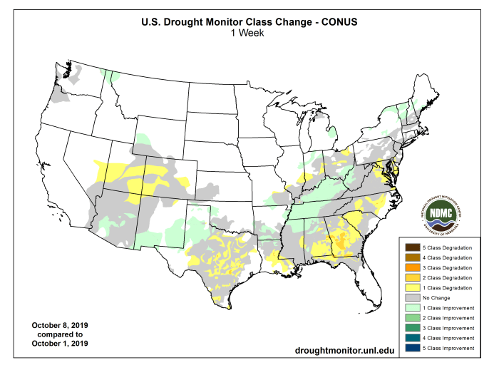 US Drought Monitor one week change map ending October 8, 2019.