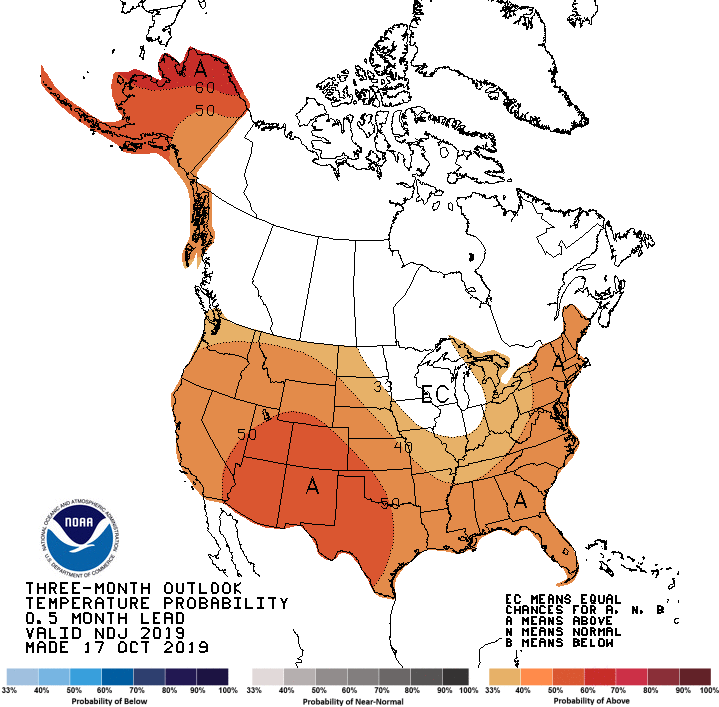 On October 17th, NOAA issued its December through February outlook for temperature, precipitation, and drought. Temperatures are favored to be above average across most of the western, southern, and eastern U.S., as well as in Alaska and Hawaii, with no parts favored to be colder than average.