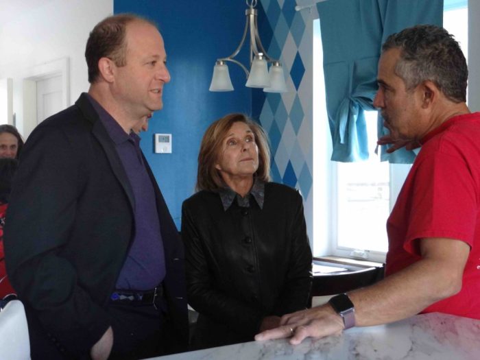 Colorado Gov. Jared Polis got explanations from Scott Gilbert, of the Roaring Fork chapter of Habitat for Humanity, during his tour of Basalt Vista…as former State Sen. Gail Schwartz listened. Photo/Habitat for Humanity Roaring Fork Valley