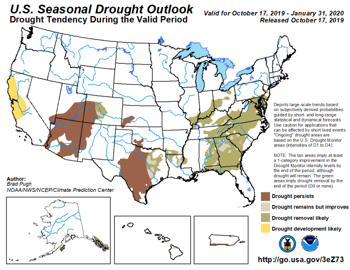 Drought is expected to improve in portions of the Southeast, Mid-Atlantic, Alaska and Hawaii, while persisting in central Texas and the Southwest.