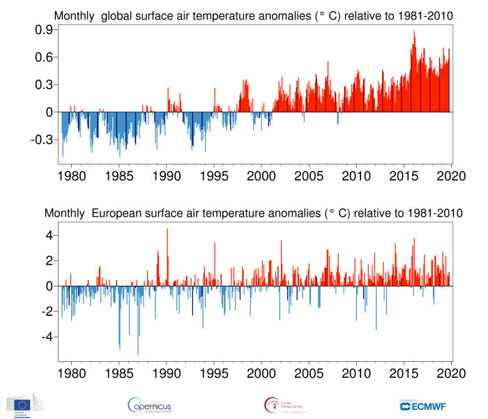 Monthly global-mean and European-mean surface air temperature anomalies relative to 1981-2010, from January 1979 to October 2019. The darker coloured bars denote the October values. Data source: ERA5. Credit: Copernicus Climate Change Service/ECMWF.