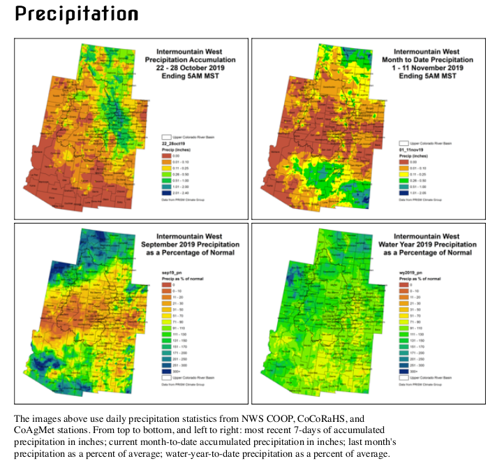 While the cold October was helpful in delaying exacerbating drought severity, continued dryness across the Four Corners region and extending north into Utah and Colorado, continues to be a growing concern. With a dry summer and poor performing monsoon, extremely dry conditions extend back to 120 days, with widespread 120-day SPIs below -2. For lower elevations that don’t benefit as much from the stellar spring snows and runoff, there is more of an immediate concern. Hydrologically, the concern isn’t as large right now either, for the reservoirs are still in good condition. Streamflows ended at base flow a little lower than normal. Soils show the very poor conditions that will again come into play during the spring thaw and meltoff. For the higher elevations, impacts right now aren’t significant, and the rest of the snow season offers plenty of time for recovery.