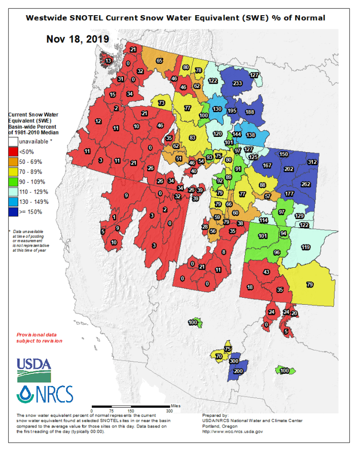 Westwide SNOTEL basin-filled map November 18, 2019 via the NRCS.
