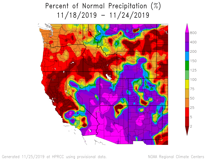 Finally, here’s the 7-day percent of normal precipitation map for the W. U.S. from the High Plains Regional Climate Center. The Colorado River Basin did OK as a percent of normal.