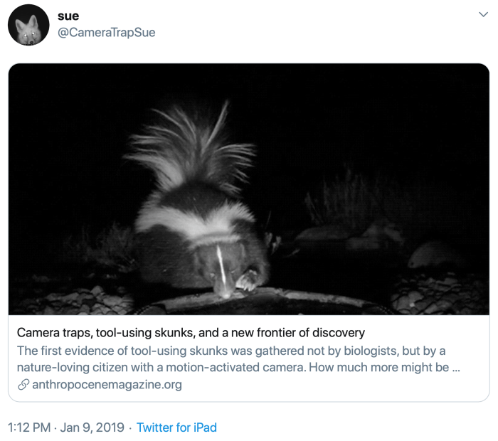 Social media can be intimidating for many of us in the white-haired set, but I was reminded recently that online platforms like Facebook and Twitter command a virtual army of potential citizen scientists armed with tools that were once only available to a handful of professionals. Nancy Averett reported in the November 2019 issue of Discover magazine that an amateur Colorado photographer named Sue Dickerson recently discovered a previously unknown example of tool use by an animal: a skunk was caught in the act of using a stone to poke a hole in the ice covering the surface of water in a dish to get a late night drink. Dickerson, a Colorado Springs resident, posted her photos on Twitter. A scientist ran across the post, and nine months later Dickerson became a co-author of a scientific paper that appeared in the journal Ecosphere.
