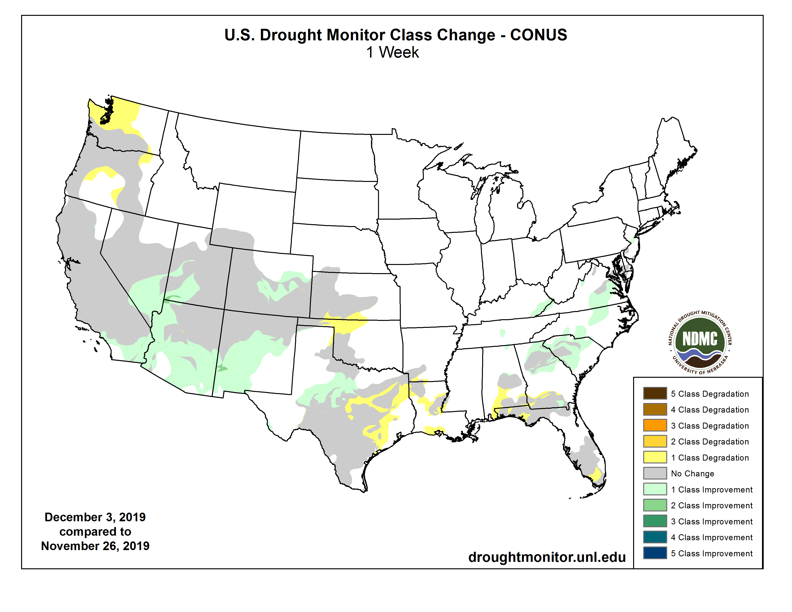 The two storms brought record-breaking precipitation to the Southwest, resulting in widespread one-category improvements across southern and central New Mexico, southern and western Arizona, southern California, southern Nevada, and southwest Utah. Heavy precipitation helped erase short-term precipitation deficits, replenished soil moisture, and improved streamflow conditions. Remaining drought and abnormally dry areas in these regions have been designated with an “L” to denote that dryness is only apparent in longer-term (greater than 4 months) indicators. While beneficial, these events were not enough to allow for improvements to the Four Corners area, which has been experiencing deficits for nearly a year. Despite the significant precipitation, much of California was left in D0 (abnormal dryness) after consultation with the state drought monitoring team. While the precipitation has helped improve conditions, water year to date deficits remain. In contrast, dryness continued to develop in the Pacific Northwest, with parts of Oregon and Washington experiencing among the driest Novembers on record. Precipitation over the last 60 days is less than 50 percent of normal across much of the region, resulting in the expansion of D0…South