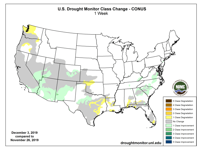 According to the National Weather Service Weather Prediction Center forecast for the remainder of the week, a storm is expected to bring rain and higher elevation snow to the West Coast, with the highest totals focused over northern California, the southwest corner of Oregon, and the Sierra Nevada. Other areas of the West will likely see lesser amounts. Farther east, cold air moving over the Great Lakes is expected to generate bands of lake effect snow. Elsewhere, dry conditions should be in place for the remainder of the week. By early next week, precipitation will begin to develop over the eastern half of the country with the heaviest amounts favored over portions of the Tennessee Valley, southern Appalachians, and parts of the Ohio River Valley and Mid-Atlantic.The Climate Prediction Center 6 to 10 day outlook for December 9-13 calls for an outbreak of cold arctic air across the across the lower 48 with temperature departures approaching -15 degrees Fahrenheit. The weather pattern favors above-normal temperatures over Alaska and the West Coast. Variable temperatures are expected along the East Coast. Precipitation is expected to be above normal for most of country, with the exception of California and the Southwest.