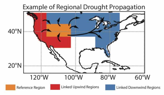 An example from the study of upwind and downwind regions in North America between which droughts have propagated through reduced moisture transport. Credit: Stanford University