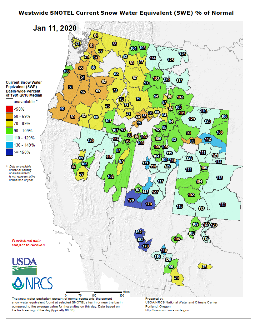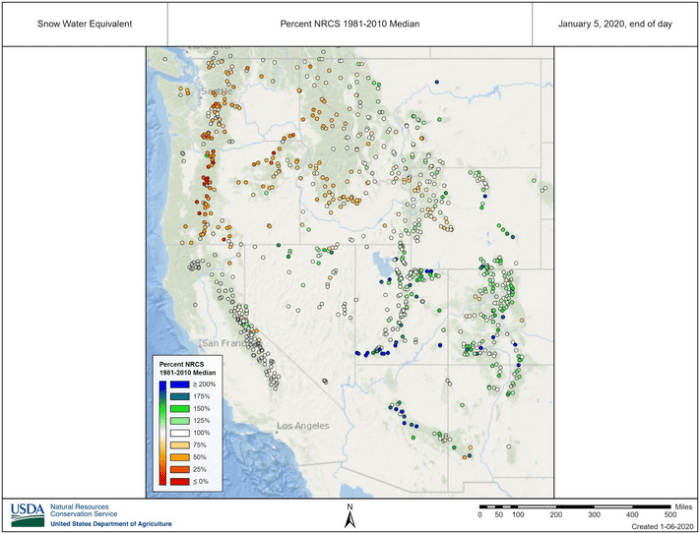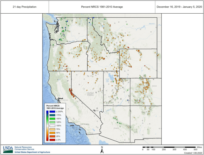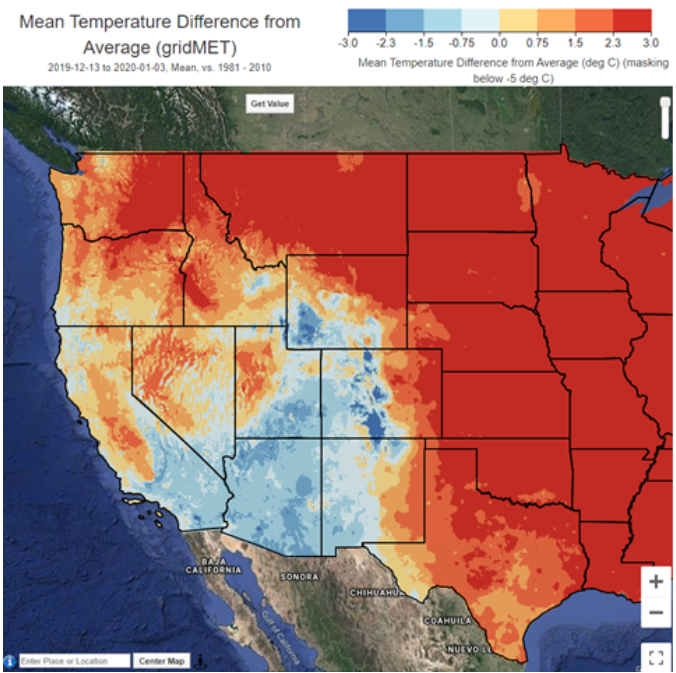 USDA Natural Resources Conservation Service (NRCS) percent of 1981-2010 median snow water equivalent (SWE) over the western U.S.USDA Natural Resources Conservation Service (NRCS) percent of 1981-2010 average precipitation over the western U.S. for the period December 16, 2019-January 5, 2020. Only stations with at least 20-years of data are included in the station averages. For an interactive version of this map please visit NRCSUniversity of Idaho’s gridded meteorological data (gridMET) mean temperature difference from the 1981-2010 average for the period December 13, 2019-January 3, 2020. For an interactive version of this map please visit Climate Engine.