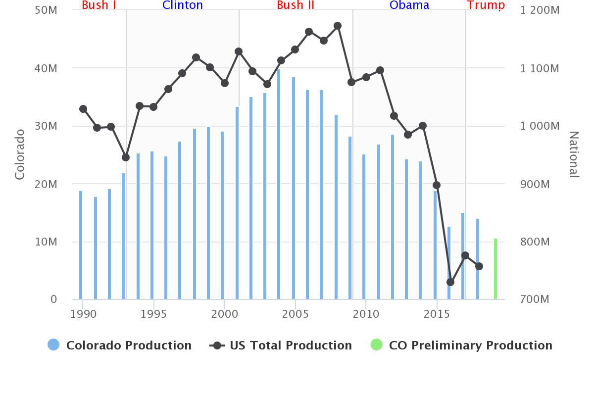 Yearly Colorado and U.S. national coal production overlapped with presidential terms. Source: U.S. Energy Information Administration, Colorado Division of Reclamation Mining and Safety Credit: Jim Hill / CPR News