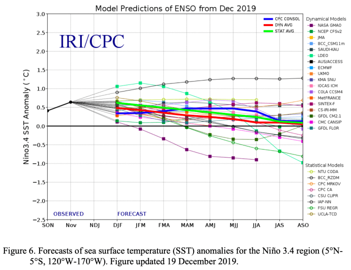 The majority of models in the IRI/CPC plume continue to mostly favor ENSO-neutral (Niño-3.4 index between -0.5°C and +0.5°C) through the Northern Hemisphere summer. For the December 2019-February 2020 season, the Niño-3.4 index is predicted to be near +0.5°C, which is consistent with the latest observations. The forecasters also favor above-average ocean temperatures to continue in the next month or two, but, in alignment with most model guidance, do not foresee a continuation over several consecutive seasons or shifts in the atmospheric circulation that would indicate El Niño. In summary, ENSO-neutral is favored through Northern Hemisphere spring 2020 (~60% chance), continuing through summer 2020 (~50% chance; click CPC/IRI consensus forecast for the chance of each outcome for each 3-month period).