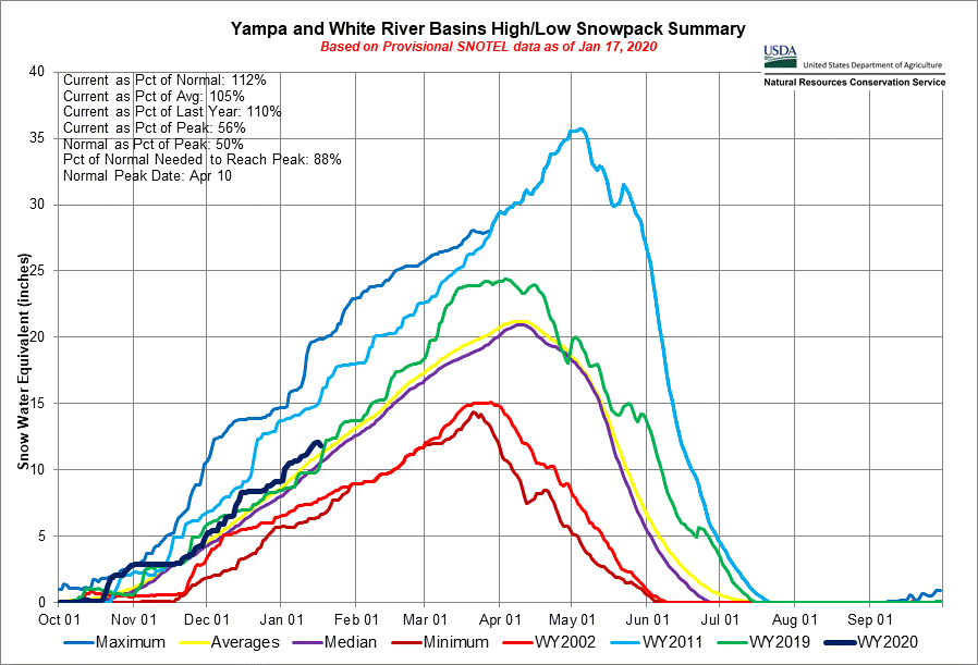 The current snowpack of the Yampa and White River Basin, which encompasses Routt County, is currently 18% above average, according to data from the Natural Resource Conservation Service.