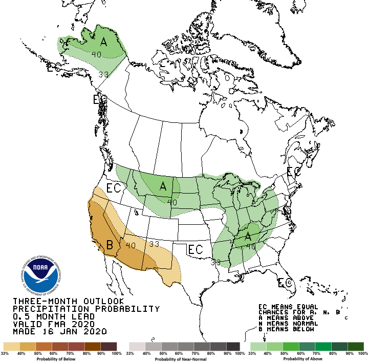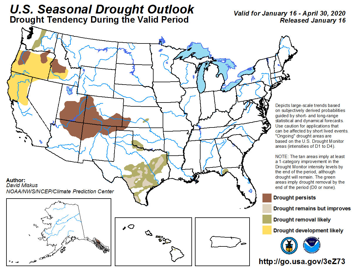 The Pacific weather systems have brought precipitation to coastal Oregon, Washington, and northern California this week, with 2 to locally over 5 inches measured in favored upslope areas. But this is the wet season and precipitation normals are high, so only a few parts of southwest Oregon, northwest California, and northwest Washington were wetter than normal for the week. The rain soaks the coastal soils and makes it wet in the short term, but the bigger hydrological picture is dry. Precipitation in the Pacific Northwest is below to much below normal for the water year to date (beginning October 1, 2019), and mountain snowpack is below normal in many areas. The Pacific fronts move quickly across the region, drying out as they cross the coastal ranges and leaving below-normal precipitation in interior Washington and Oregon. Streams are near to above normal along the coast, but below normal east of the coastal ranges. Other indicators reveal dryness east of the coastal ranges, including soil moisture, SPI, and SPEI, especially for the 1 to 9 month time scales. As a result, the 3 D1 areas in interior Washington and Oregon were joined, and D0 expanded in northeast Washington. D0-D1 expanded in southeast Idaho and D0 expanded in southwest Montana, where 3-month precipitation deficits were notable. But above-normal precipitation over the last 30 days prompted contraction of D0 in the Idaho panhandle and adjacent Montana, and in parts of eastern Idaho. The impacts indicator in the Pacific Northwest was changed from S to SL to indicate both short-term and long-term precipitation deficits…