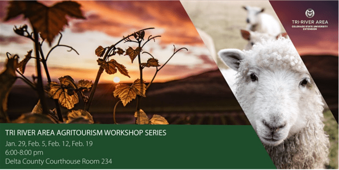 Tri-River Area Agritourism Series – Growers and producers are invited to attend this 4 part series from 6-8pm at the Delta County Courthouse Room #234 each Wednesday night beginning January 29, 2020. The Tri River Area Agritourism Workshop Series will cover topics including, Legalities and Insurance, Marketing and Advertising, Special Events, and Partnership Building and Craft 101 Applications. The workshop series features industry leading speakers from Colorado Agritourism Association, Colorado Department of Agriculture, Colorado State University, Rocky Mountain Farmers Union and more. Registration includes dinner at each session, attend all four sessions for $50 or $15 per session.