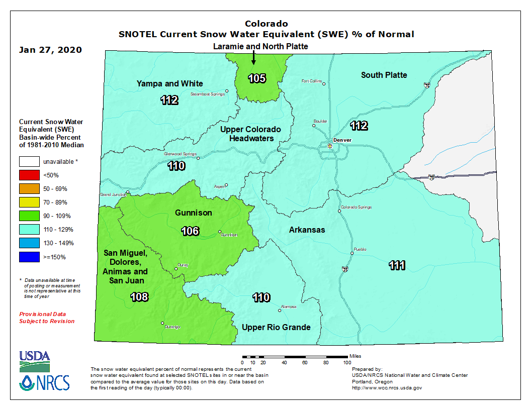 Colorado snowpack basin-filled map January 27, 2020 via the NRCS.